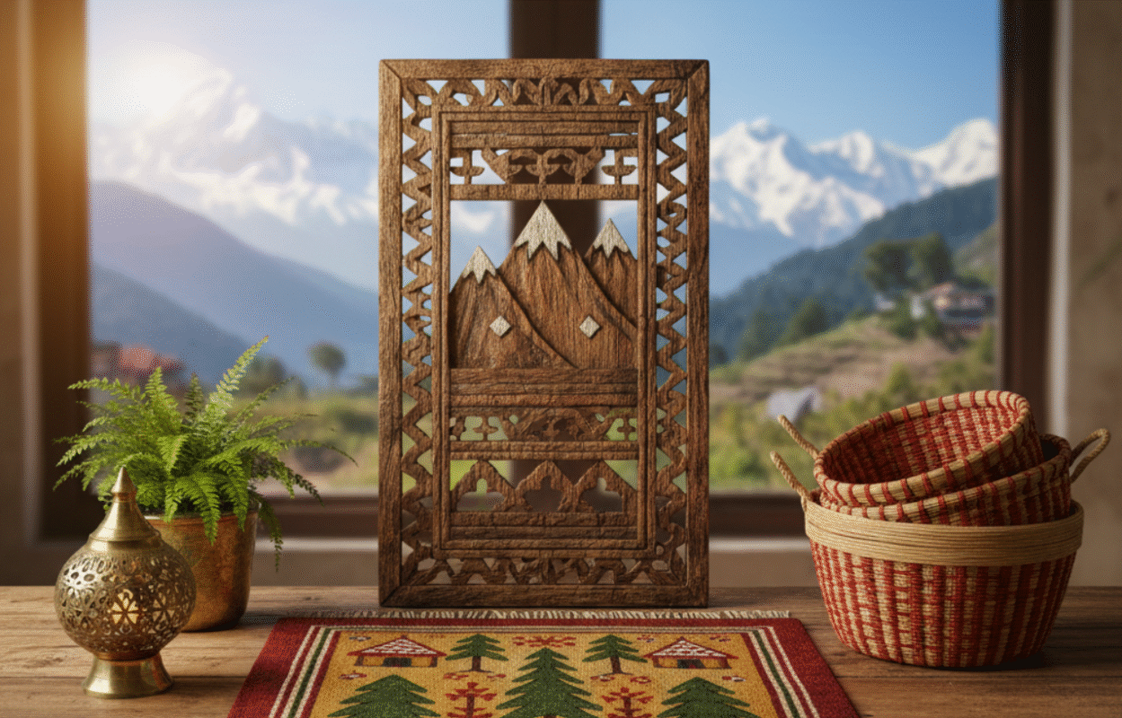 Uttarakhand Handcrafted Pahadi Wood Carving Wall Art & Traditional Aasan Rug Set